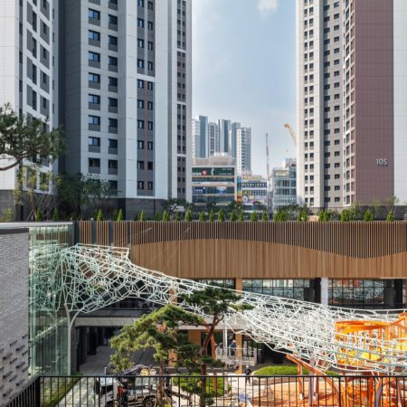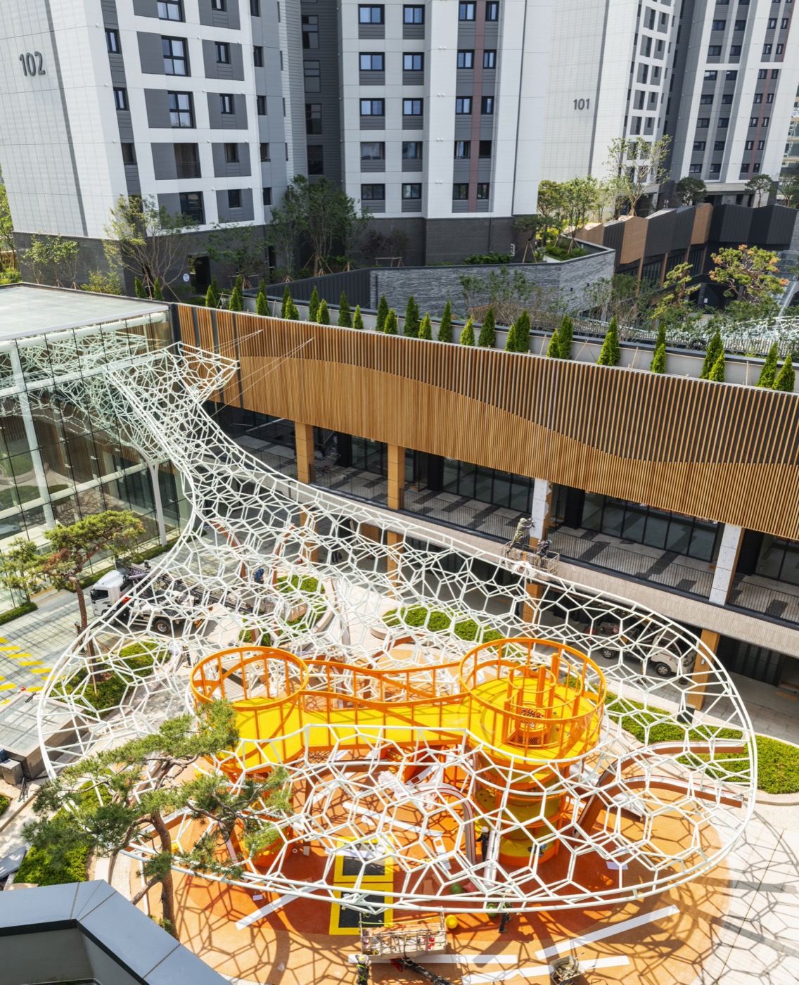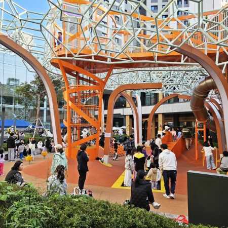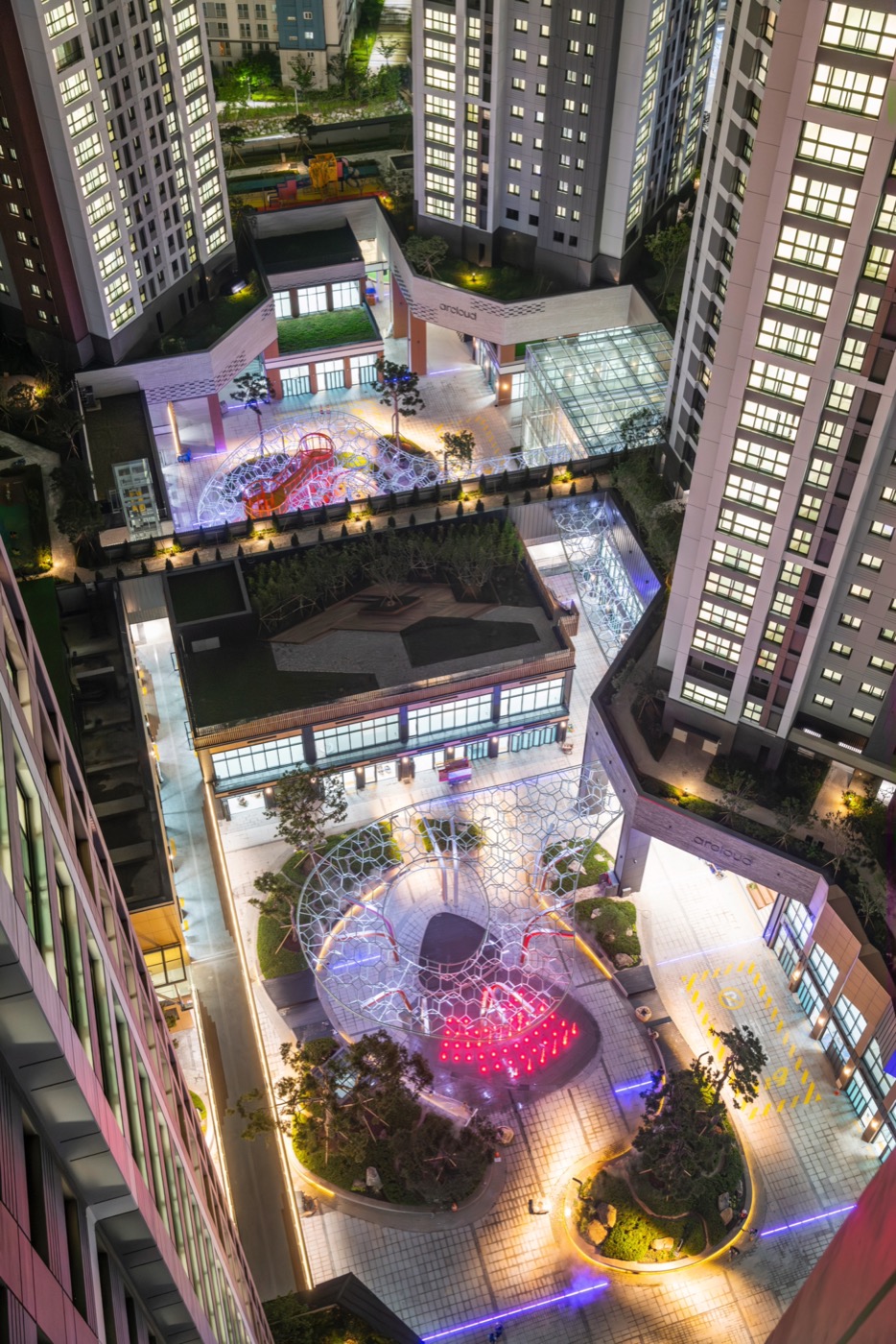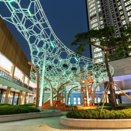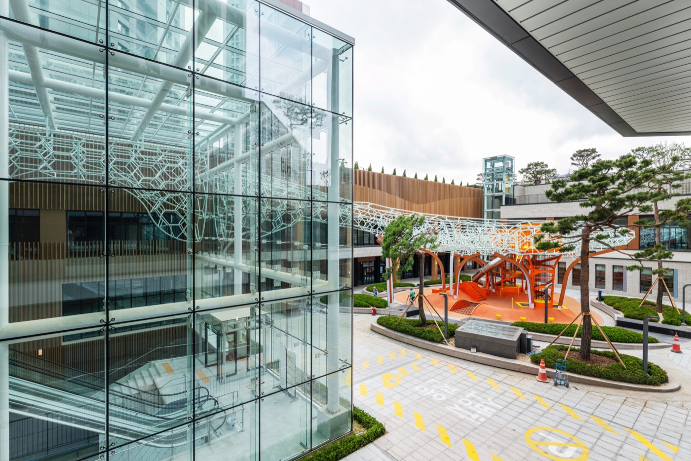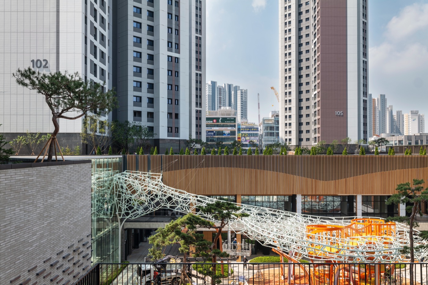 The strategically placed hills – green knolls of Korean shrubs and tall pine trees – form a rolling landscape and help frame and organise the entire space. They create two distinct plazas – one dedicated to play and the other for events – whilst respecting the need for clear sight lines and accessibility to the adjacent retail units. The third main core is the atrium. Initially intended as circulation space, it was activated as performance stage, cinema, and playground.
