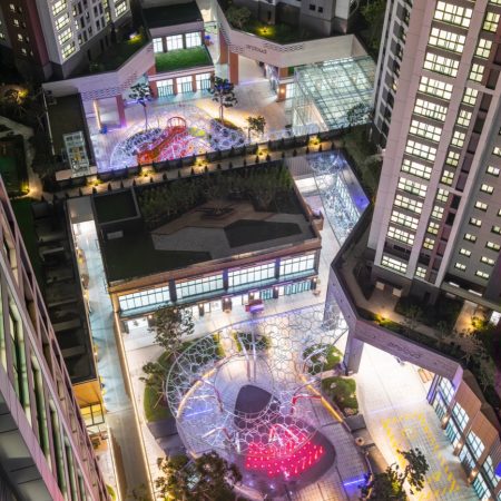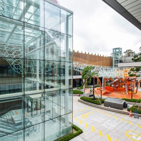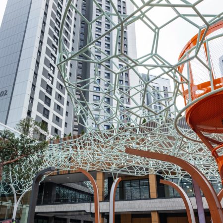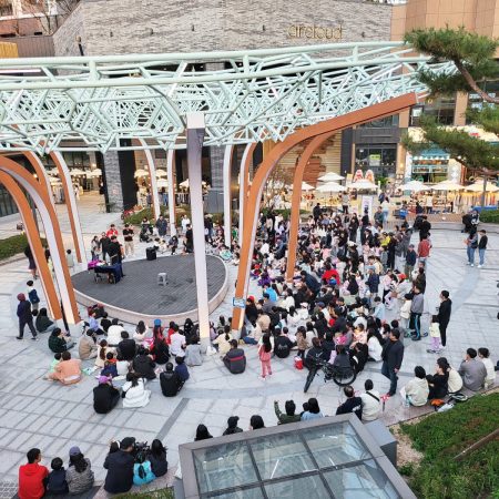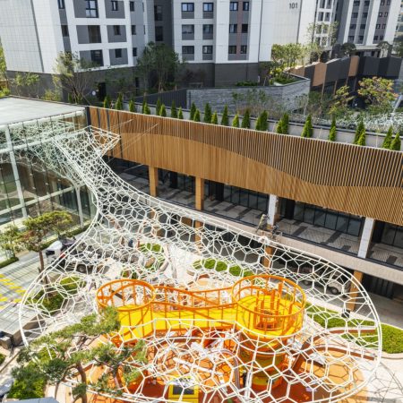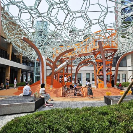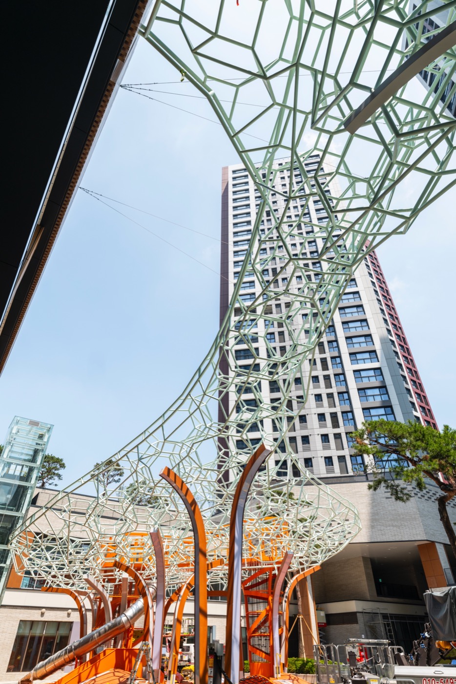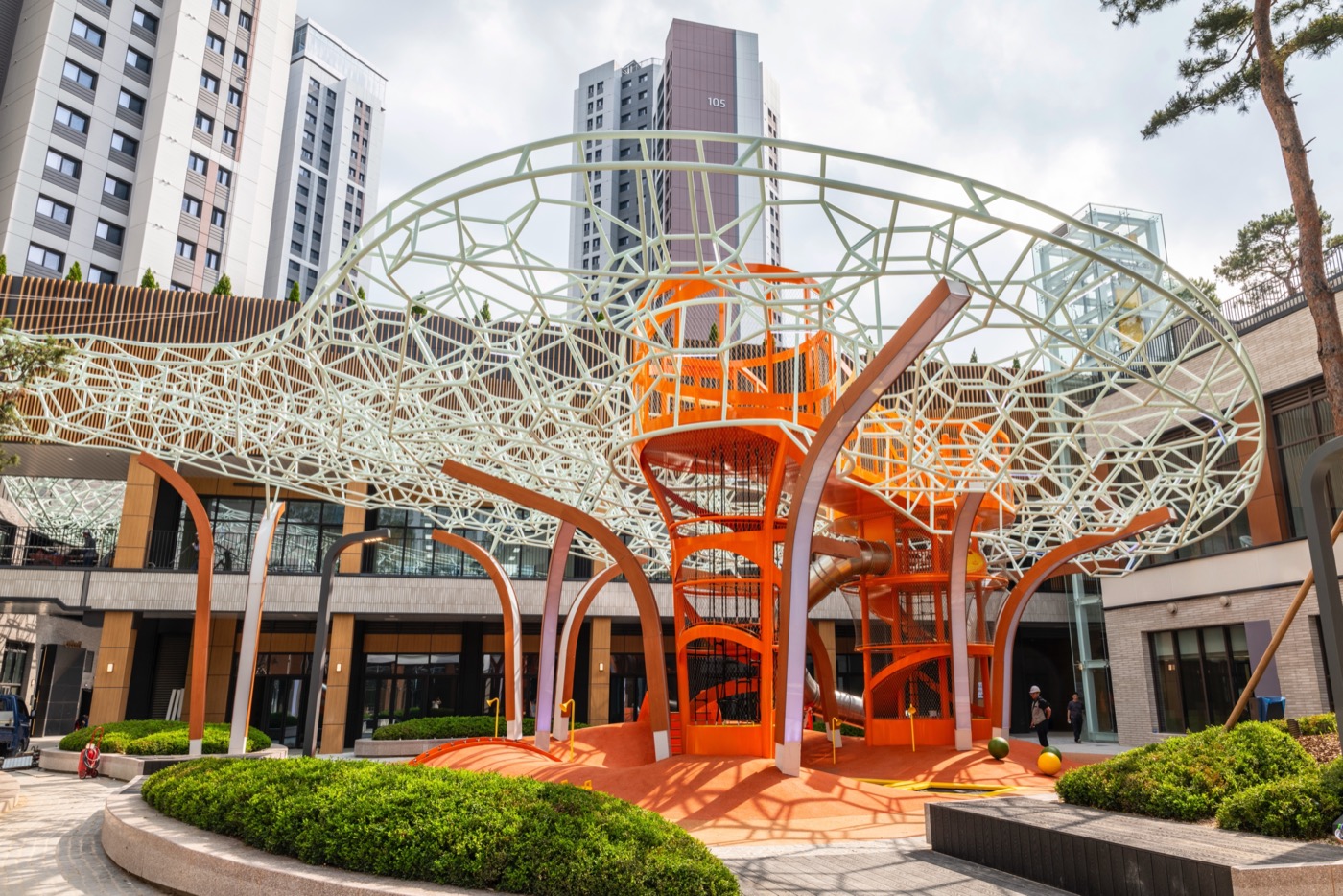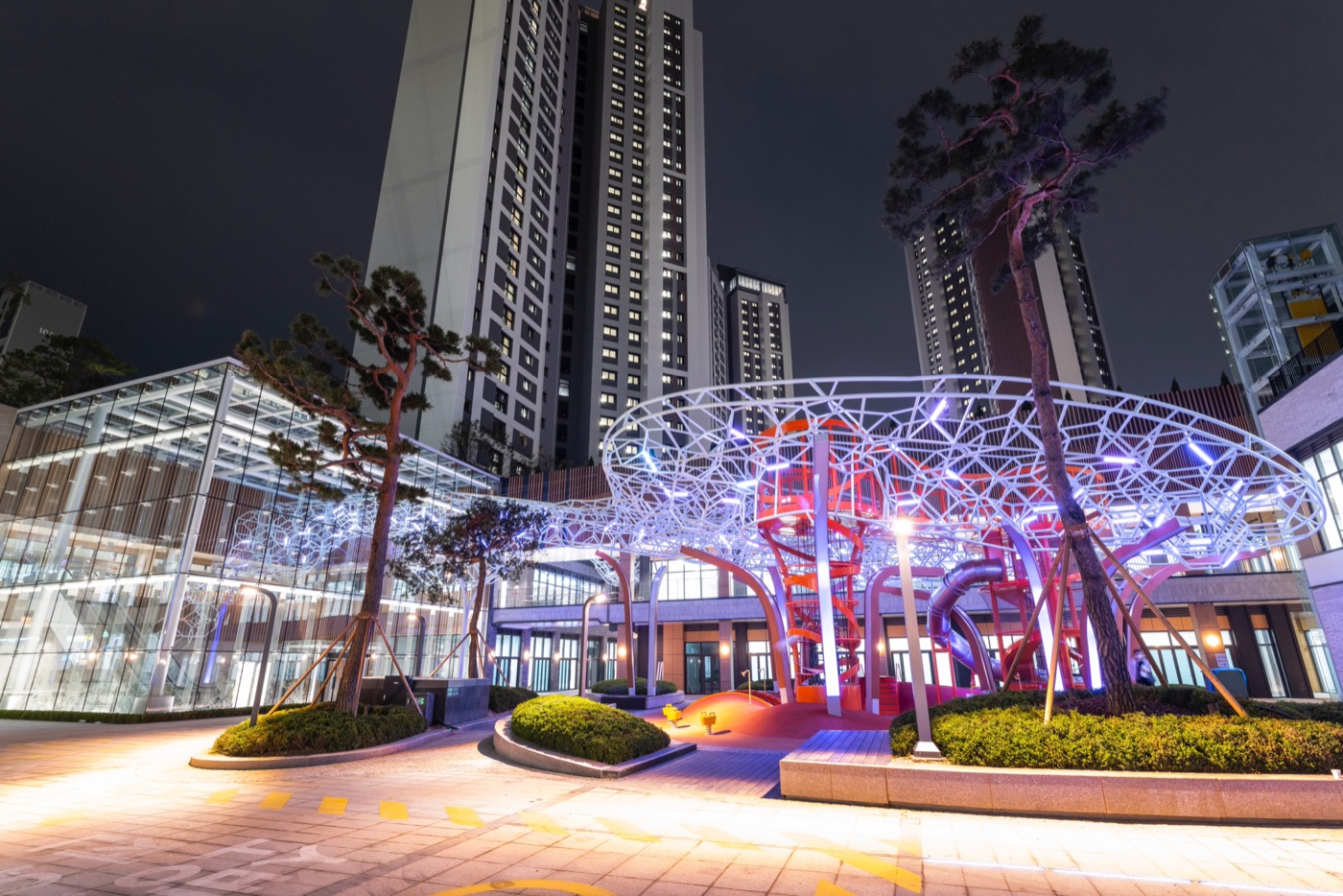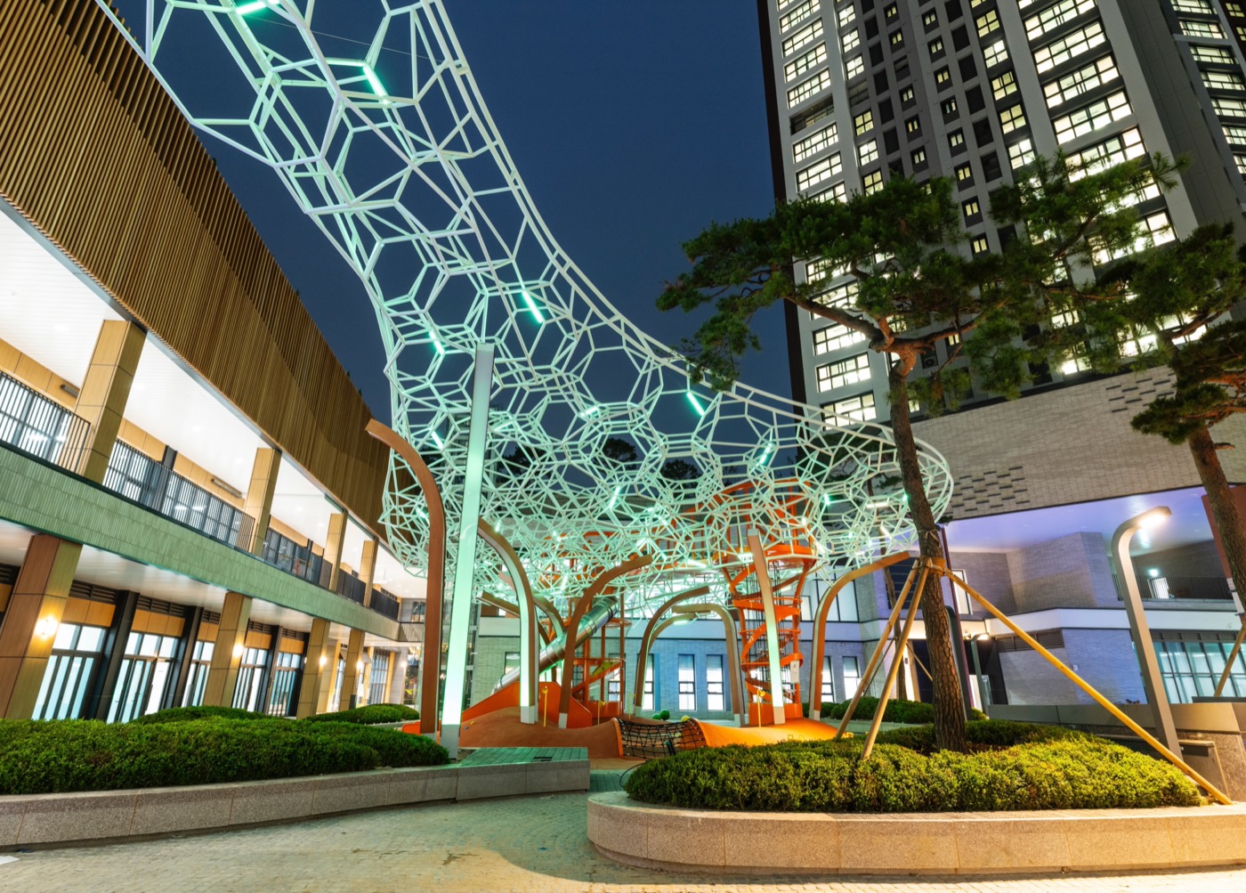 The strategically placed hills – green knolls of Korean shrubs and tall pine trees – form a rolling landscape and help frame and organise the entire space. They create two distinct plazas – one dedicated to play and the other for events – whilst respecting the need for clear sight lines and accessibility to the adjacent retail units. The third main core is the atrium. Initially intended as circulation space, it was activated as performance stage, cinema, and playground.