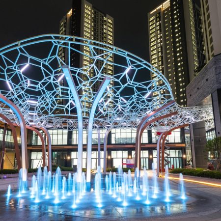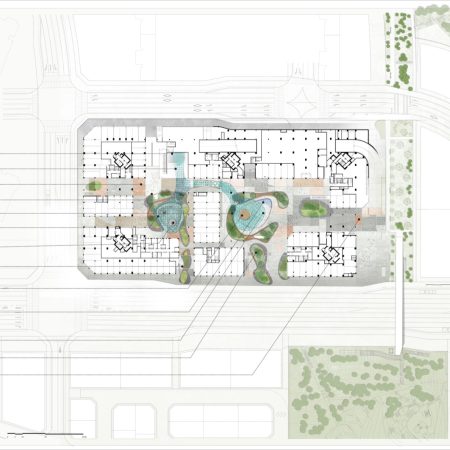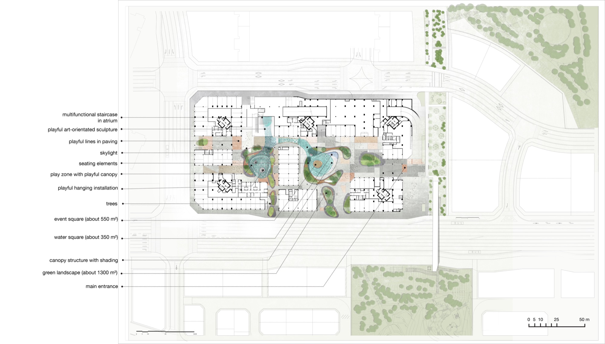 In line with the brief, we envisioned the plazas of the mall to be the new public realm for the Arcloud community: attractive and inviting spaces, aimed at celebrating life’s rhythm. The mall offers diverse atmospheres, changing throughout the day and seasons. It features multifunctional event spaces and a splash pool.