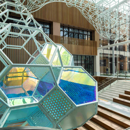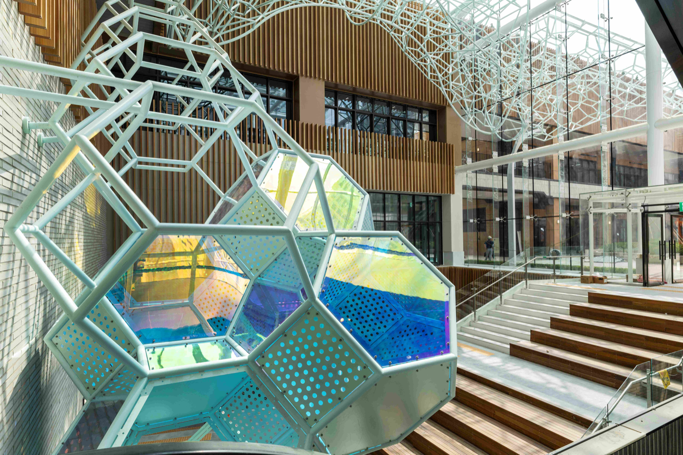 The structure visually links multiple levels, accessible from different floors that connect people, places and activities. Rising from the atrium, it stretches outside going towards the two main plazas.