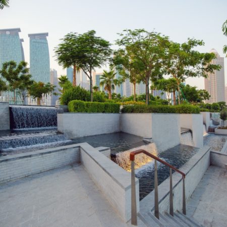 Hotel Park, located in the West Bay downtown area of Doha, is one of the largest decked gardens in the world. The park conceals a four-storey basement parking facility below and provides a strategic public realm link between the waterfront, the landmark Sheraton Hotel, the corniche and the city’s financial district, making it a focal point for social interaction in the wider West Bay district.
