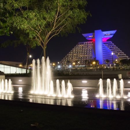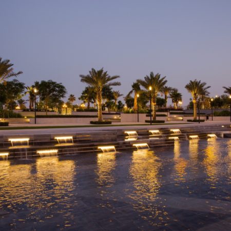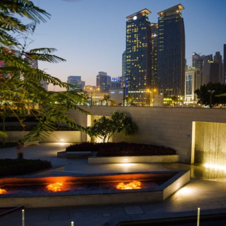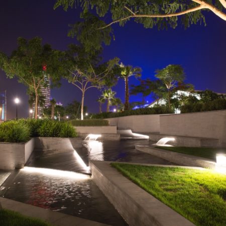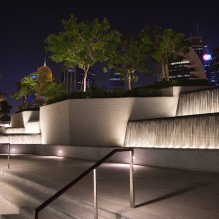 Hotel Park truly comes alive at night, the lighting design concept was inspired by the motif of a night-time festival against the vibrant and glowing skyline backdrop of West Bay. The lighting is subtle and picks up the detail of level changes, sculptural forms, tree canopies and moving water to enhance the visitors’ experience of the park at night.