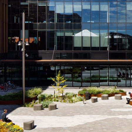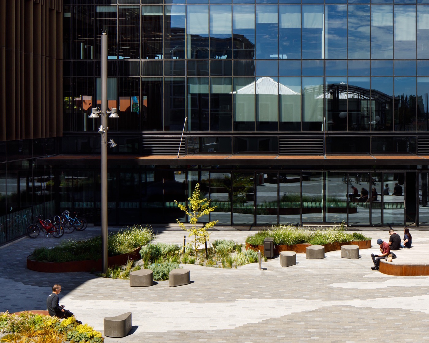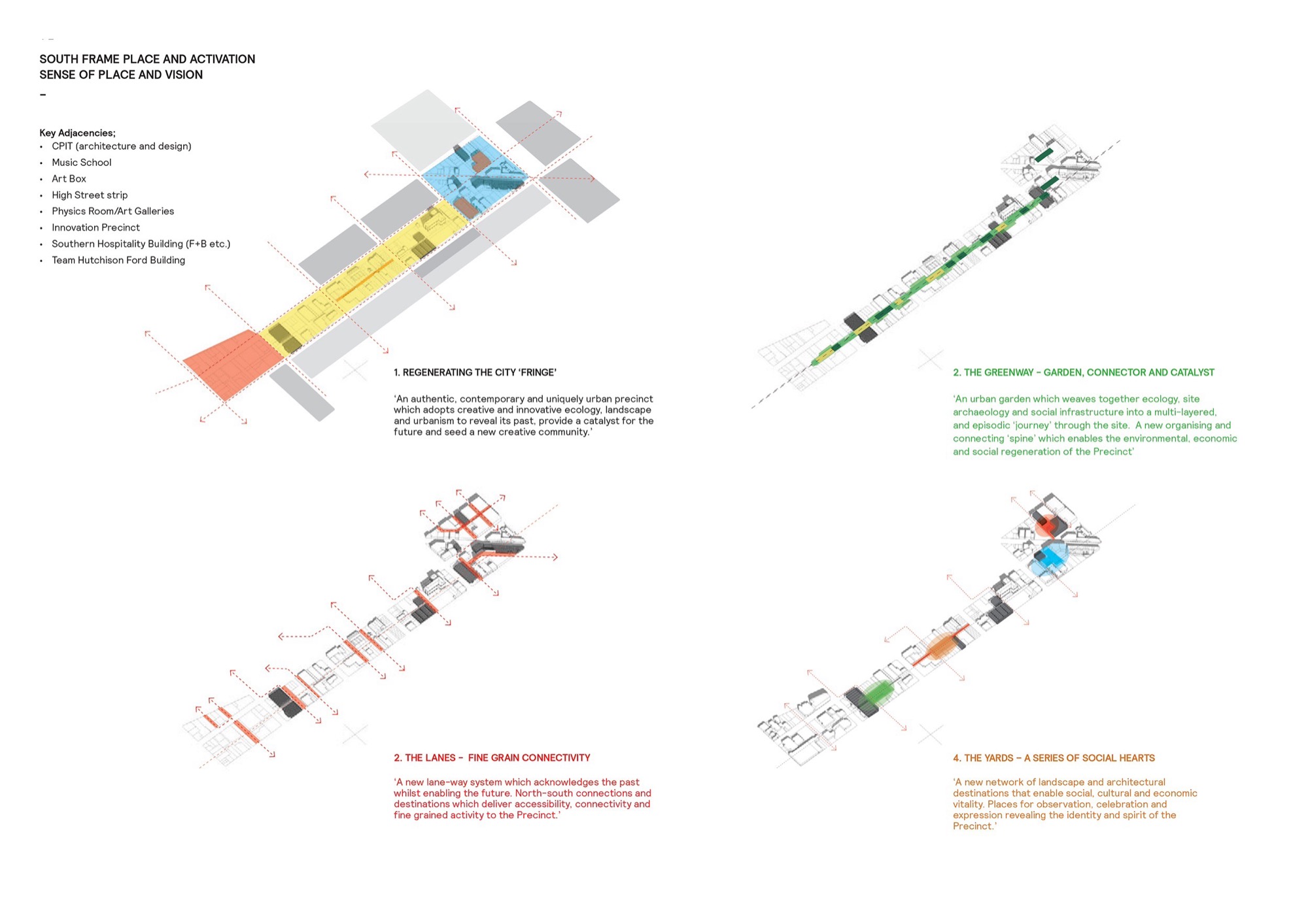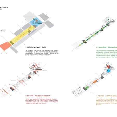 1. The Greenway: an urban garden weaving together ecology, site archaeology, social infrastructure, and commercial activation into a multi-layered and episodic journey that traverses four blocks. This active travel spine serves as an organising and connecting venue.